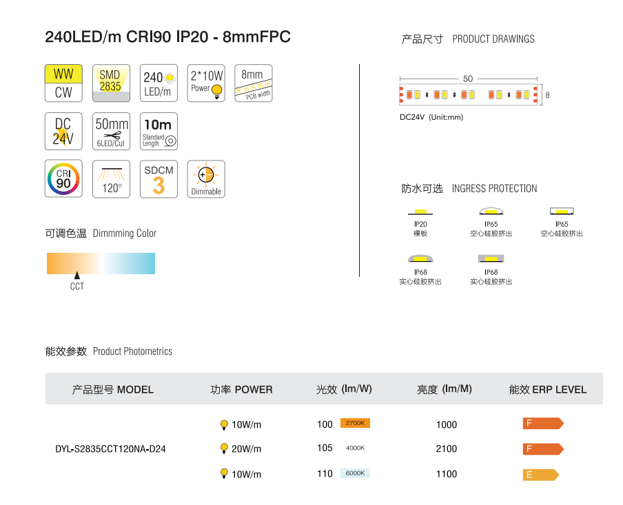 Product Name: SMD2835 240led/m Flexible strip light LED Chips:SMD2835 LED Qty:240PCS Working Voltage:DC24V Power:≤10W Lumen/Led:24-26LM Material:FPC Size:1000*8*0.2mm Dimming Color:2700K/6000K/4000K