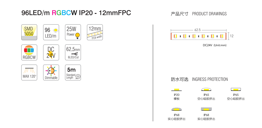 Product Name: SMD5050 RGBCW 96led/m Flexible strip light LED Chips:SMD5050 LED Qty:96PCS Working Voltage:DC24V Power:≤25W Lumen/M:1592LM Material:FPC Size:1000*10*0.2mm Dimming Color:RGBCW
