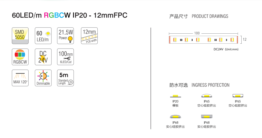 Product Name: SMD5050 60led/m Flexible strip light LED Chips:SMD5050 LED Qty:60PCS Working Voltage:DC24V Power:≤21W Lumen/M:1370LM Material:FPC Size:1000*10*0.2mm Dimming Color:RGBCW