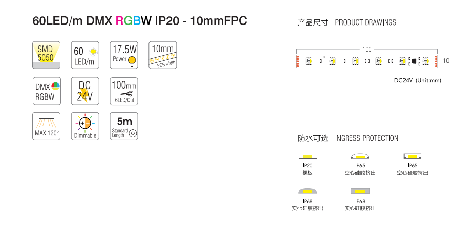 Product Name: SMD5050 DMX RGBW 60led/m Flexible strip light LED Chips:SMD5050 LED Qty:60PCS Working Voltage:DC24V Power:≤17.5W Lumen/M:1142LM Material:FPC Size:1000*10*0.2mm Dimming Color: RGBW